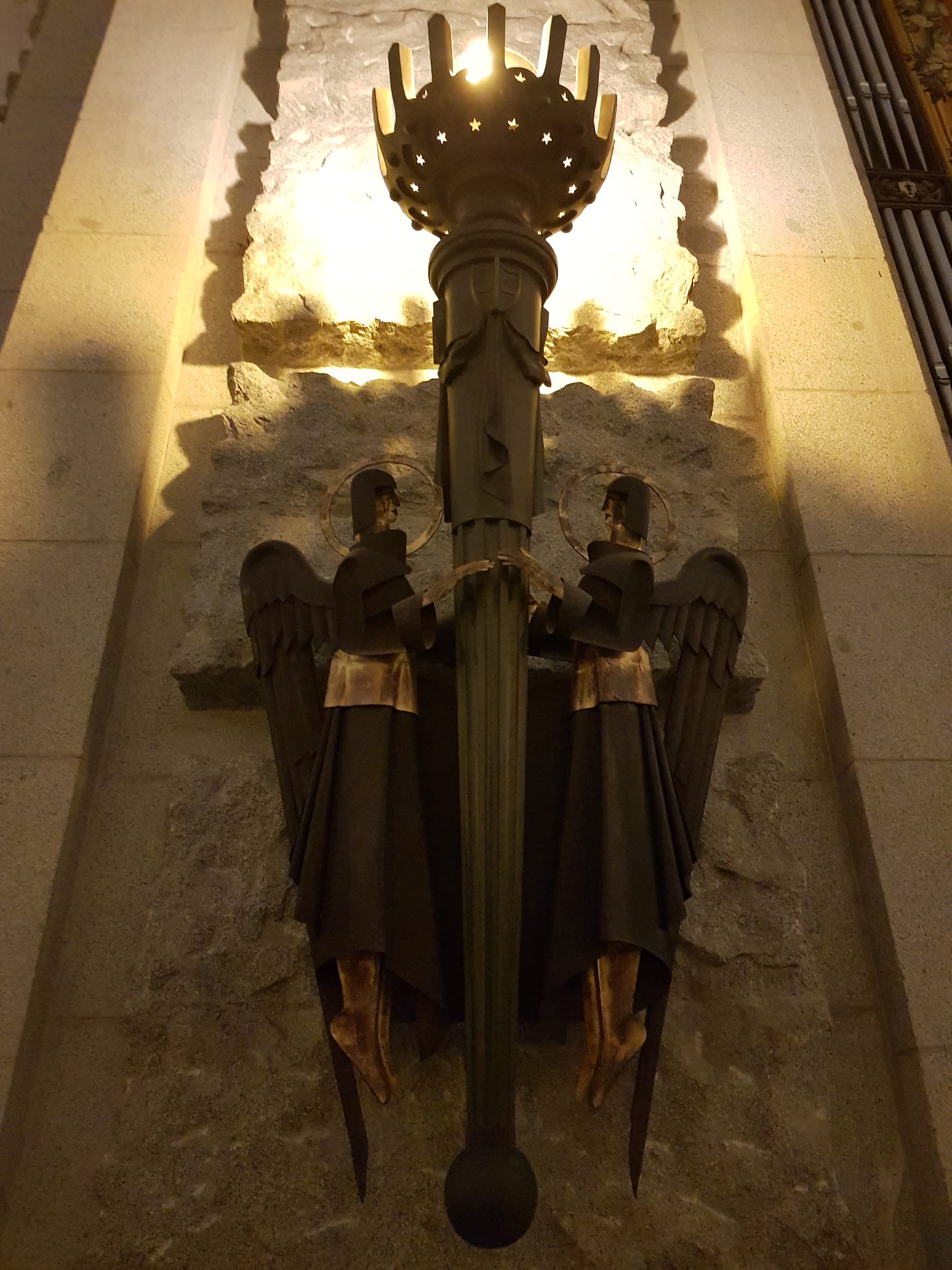 The entrance is through towering, black iron gates, and even the angels on the light fittings are weirdly fascistic: dressed in long black robes, with severe black fringes, like 1930s cabaret flappers suddenly enraptured by the holy spirit. “Art deco gothic”, is Ian’s verdict.
